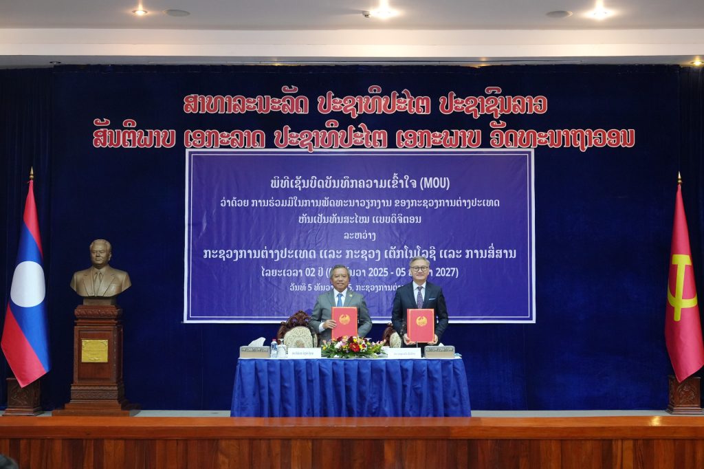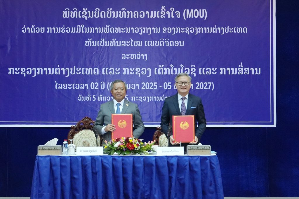ໃນຕອນບ່າຍຂອງວັນທີ 5 ທັນວາ 2025 ທີ່ ກະຊວງການຕ່າງປະເທດ, ໄດ້ມີພິທີລົງນາມໃນບົດບັນທຶກຄວາມເຂົ້າໃຈ (MOU) ວ່າດ້ວຍການຮ່ວມມື ໃນການພັດທະນາວຽກງານຂອງກະຊວງການຕ່າງປະເທດເປັນທັນສະໄໝ ແບບດິຈິຕອນ ລະຫວ່າງ ກະຊວງການຕ່າງປະເທດ ແລະ ກະຊວງເຕັກໂນໂລຊີ ແລະ ການສື່ສານ ມີບັນດາຮອງລັດ ຖະມົນຕີ ຄະນະກົມ ແລະ ພະນັກງານຈາກພາກສ່ວນທີ່ກ່ຽວຂ້ອງຂອງທັງສອງຝ່າຍ ເຂົ້າຮ່ວມເປັນສັກຂີພິຍານທັງໝົດ ຈຳນວນ 65 ທ່ານ ບົດບັນທຶກຄວາມເຂົ້າໃຈດັ່ງກ່າວ ໄດ້ລົງນາມໂດຍ ທ່ານ ທອງສະຫວັນ ພົມວິຫານ ລັດຖະມົນຕີກະຊວງການຕ່າງປະເທດ ແລະ ທ່ານ ບັນດິດ ສຈ ບໍ່ວຽງຄໍາ ວົງດາລາ ລັດຖະມົນຕີກະຊວງເຕັກໂນໂລຊີ ແລະ ການສື່ສານ.