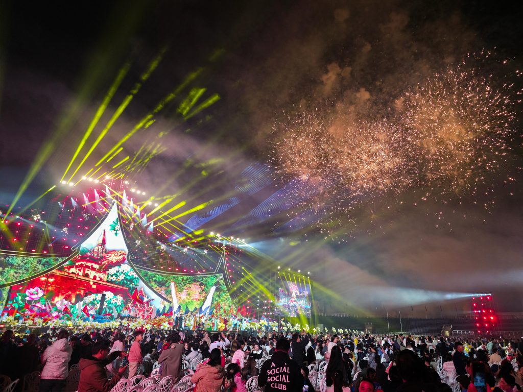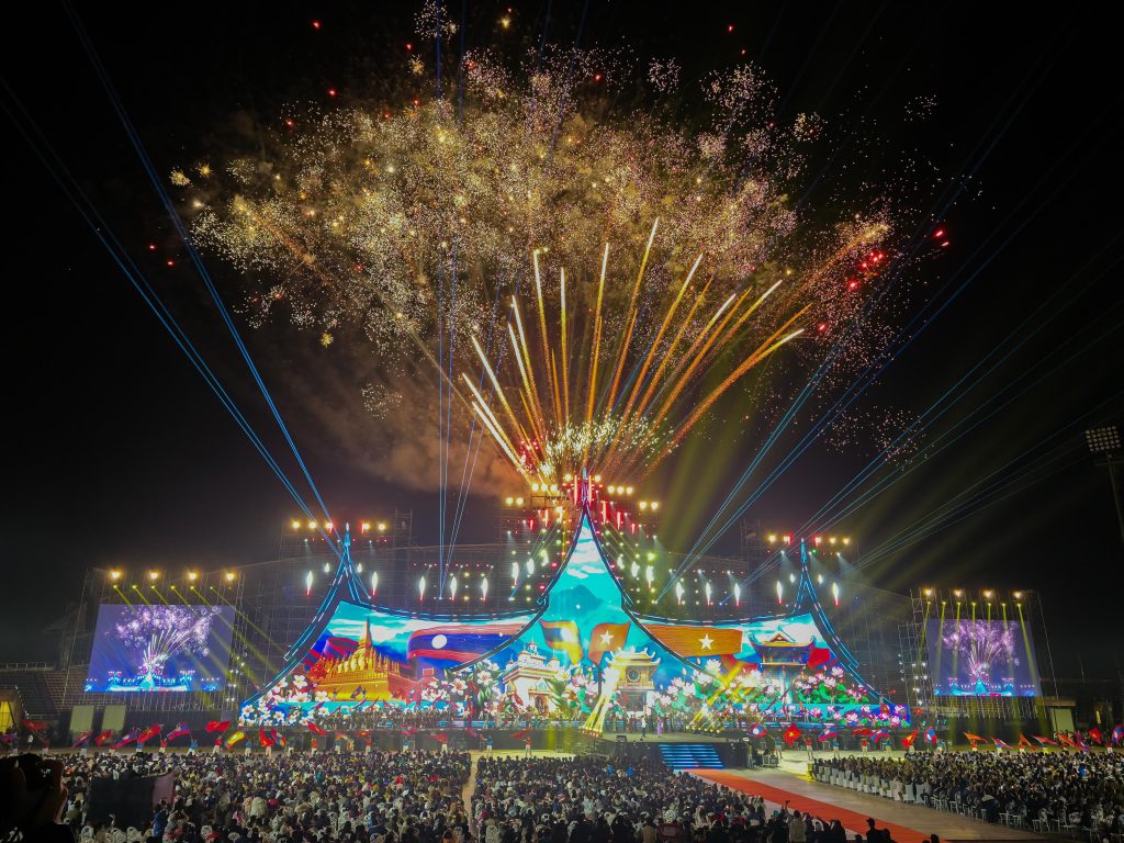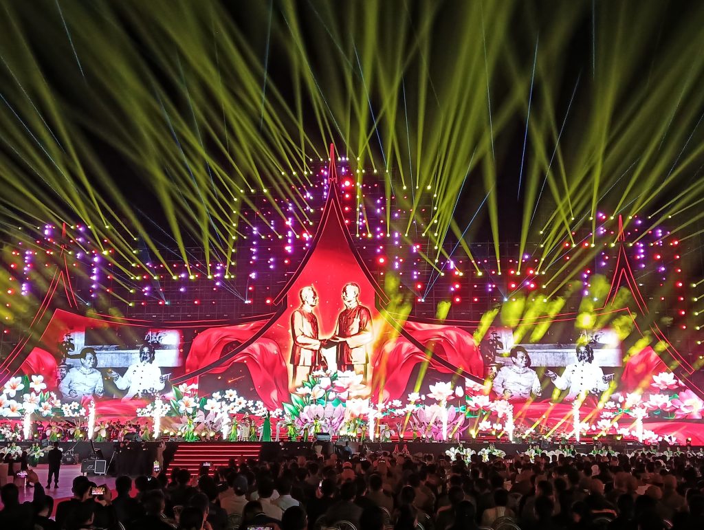 ງານສະແດງສິລະປະແບບພິເສດ ເພື່ອຄໍານັບຊົມເຊີຍຜົນສໍາເລັດກອງປະຊຸມໃຫຍ່ ຄັ້ງທີ XII ຂອງພັກປະຊາຊົນ ປະ ຕິວັດລາວ ແລະ ລະນຶກເຖິງວັນຄ້າຍວັນເກີດ ຄົບຮອບ 105 ປີ ຂອງປະທານໄກສອນ ພົມວິຫານ ພາຍໃຕ້ຫົວຂໍ້ “ລາວ-ຫວຽດນາມບົດເພັງແຫ່ງມິດຕະພາບ” ຈັດຂຶ້ນວັນທີ 9 ມັງກອນ 2026 ທີ່ສະໜາມກີລາແຫ່ງຊາດ (ຫຼັກ16) ໂດຍໃຫ້ກຽດເຂົ້າຮ່ວມຂອງ ສະຫາຍ ທອງລຸນ ສີສຸລິດ ເລຂາທິການໃຫຍ່ຄະນະບໍລິຫານງານສູນກາງພັກ ປະທານປະເທດ ສະຫາຍ ສອນໄຊ ສີພັນດອນ ກຳມະ ການກົມການເມືອງສູນກາງພັກ ນາຍົກລັດຖະມົນຕີ ສະ ຫາຍ ຫງວຽນ ວັນຮຸ່ງ ກໍາມະການສູນກາງພັກ ກອມມູນິດຫວຽດນາມ ລັດຖະມົນຕີ ກະຊວງວັດທະນະທຳ ກີລາ ແລະ ທ່ອງທ່ຽວ ສສ ຫວຽດນາມ ພ້ອມດ້ວຍບັນດາການນໍາພັກ-ລັດຂັ້ນສູງ ອະດີດການນໍາ ທູຕານຸທູດ ພະ ນັກງານ ທະຫານ ຕຳຫຼວດ ປະຊາຊົນຊາວນະຄອນຫຼວງວຽງຈັນ ແລະ ຊາວຫວຽດນາມເຂົ້າຮ່ວມ.