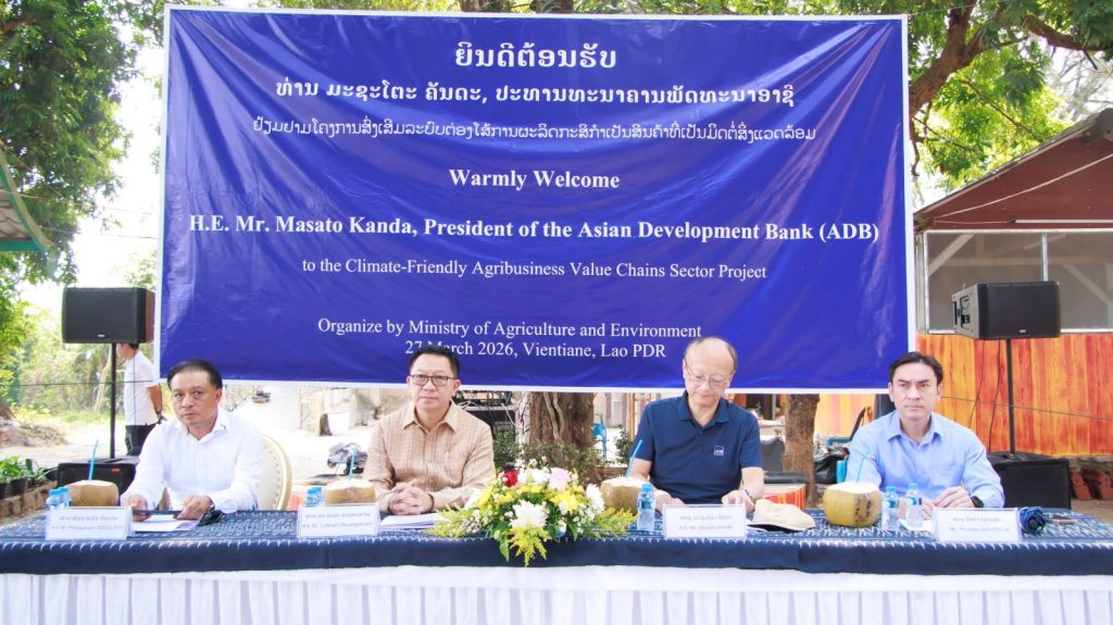 ໃນທ້າຍອາທິດຜ່ານມາ ທ່ານ ມະຊະໂຕະ ຄັນດະ ປະທານທະນາຄານພັດທະນາອາຊີ (ADB) ພ້ອມດວ້ຍຄະນະ ໄດ້ເດີນທາງມາຢ້ຽມ ຢາມ ແລະ ເຮັດວຽກ ຢູ່ ສປປ ລາວ ໃຫ້ກຽດຕ້ອນຮັບໂດຍ ທ່ານ ປອ ລິນຄຳ ດວງສະຫວັນ ລັດຖະມົນຕີກະຊວງກະສິກໍາ ແລະ ສິ່ງ ແວດລ້ອມ ທ່ານ ພົງສະຫວັນ ສີສຸລາດ ຮອງລັດຖະມົນຕີກະຊວງການຕ່າງປະເທດ ທ່ານ ໂພຄໍາ ໄຊຍະສອນ ຮອງປະທານຄະນະກຳມະການປົກຄອງນະຄອຫຼວງວຽງຈັນ ທ່ານ ປອ ອານົງສອນ ພົມມະຈັນ ຫົວໜ້າກົມສົ່ງເສີມກະສິກໍາ ແລະ ສະຫະກອນ ພ້ອມດ້ວຍຕາງໜ້າ ຈາກບັນດາຫ້ອງຫານ ກົມທີ່ກ່ຽວຂ້ອງຈາກ 3 ກະຊວງ ບັນດາກຸ່ມປູກ-ກຸ່ມຜະລິດ ຂອງບ້ານດອນຊິງຊູ້ ບ້ານໃໝ່ ບ້ານຈຳປາ ບ້ານໂນນແກ້ວ ເຂົ້າຮ່ວມ.