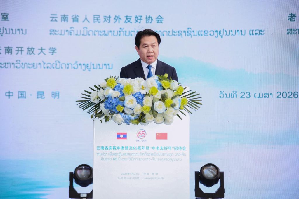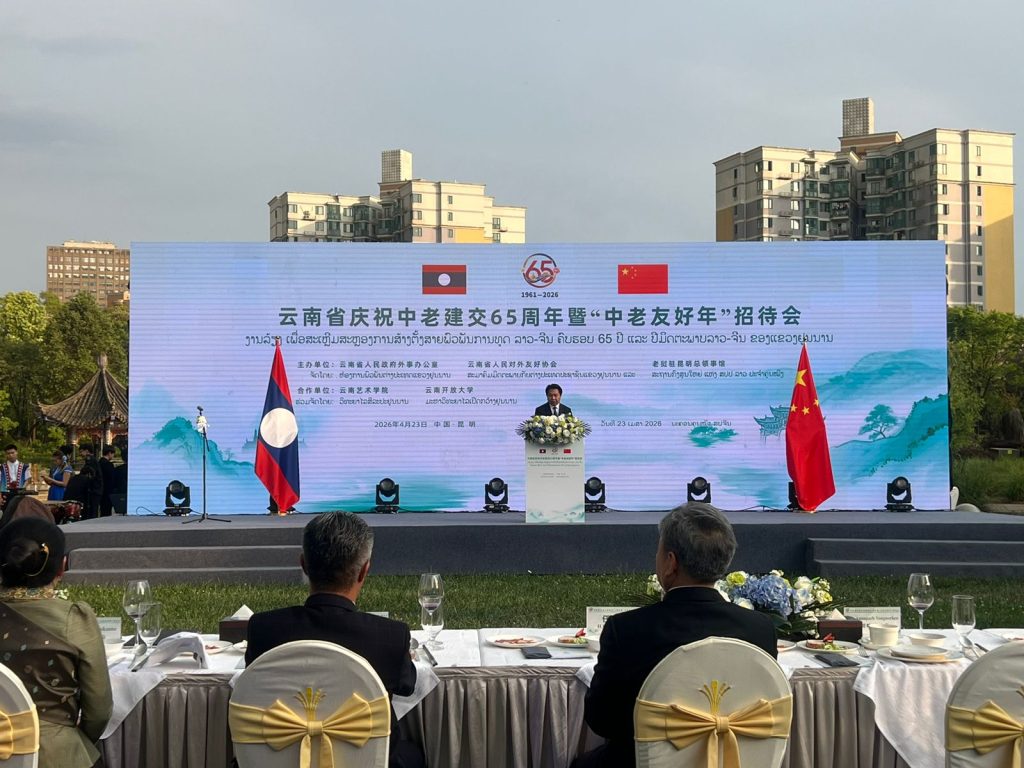 ຈາກນັ້ນ, ທ່ານຮອງລັດຖະມົນຕີ ກະຊວງການຕ່າງປະເທດ ໄດ້ສືບຕໍ່ເຂົ້າຮ່ວມ ແລະ ມີຄໍາເຫັນໃນງານລ້ຽງສະເຫຼີມສະ ຫຼອງວັນສ້າງຕັ້ງສາຍພົວພັນການທູດ ລາວ-ຈີນ ຄົບ ຮອບ 65 ປີ ແລະ ປີມິດຕະພາບ ລາວ-ຈີນ ຂອງແຂວງຢຸນໜານ, ໂດຍການເປັນເຈົ້າພາບຮ່ວມກັນ ລະຫວ່າງ ສະ ຖານກົງສຸນໃຫຍ່ ແຫ່ງ ສປປ ລາວ ທີ່ ນະຄອນຄຸນໝິງ ແລະ ສະມາຄົມມິດຕະພາບກັບຕ່າງປະເທດຂອງແຂວງຢຸນໜານ, ຫ້ອງການພົວພັນຕ່າງປະເທດແຂວງຢຸນໜານ, ເຊີ່ງການນໍາຂັ້ນສູງຂອງແຂວງຢຸນໜານ ນໍາໂດຍ ທ່ານ ເຣີ້ນ ຈຸ່ນຮ້າວ, ຮອງປະທານຄະນະປະຈໍາ ສະພາຜູ້ແທນປະຊາຊົນແຂວງຢຸນໜານ ແລະ ພະແນກການທີ່ກ່ຽວຂອງຂອງແຂວງ ແລະ ຈາກ ສປປ ລາວ ເຂົ້າຮ່ວມ.ວັນທີ 24 ເມສາ 2026, ທີ່ ກິ່ງແຂວງສິບສອງພັນນາ,