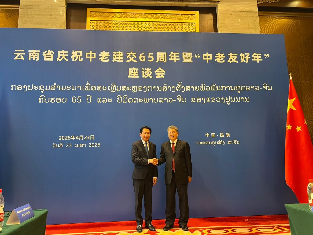 ວັນທີ 23 ເມສາ 2026, ທ່ານ ຮອງລັດຖະມົນຕີ ອານຸພາບ ວົງໜໍ່ແກ້ວ ໄດ້ເຂົ້າຮ່ວມ ແລະ ເປັນກຽດກ່າວຄໍາເຫັນໃນກອງປະຊຸມສໍາມະນາ ເພື່ອສະເຫຼີມສະຫຼອງການສ້າງຕັ້ງສາຍພົວພັນການທູດ ລາວ-ຈີນ ຄົບຮອບ 65 ປີ ແລະ ປີມິດຕະພາບ ລາວ-ຈີນ ຂອງແຂວງຢຸນໜານ ໂດຍມີຜູ້ຕາງໜ້າຈາກສະພາການຄ້າ ແລະ ອຸດສາຫະກໍາແຫ່ງ ຊາດລາວ ພ້ອມດ້ວຍຫົວໜ່ວຍທຸລະກິດ ລາວ-ຈີນ, ຕົວ ແທນນັກສຶກສາລາວ ທີ່ກໍາລັງສຶກສາຢູ່ແຂວງຢຸນນານ ແລະ ບັນດາສື່ມວນຊົນ ເຂົ້າຮ່ວມຫຼາຍກວ່າ 80 ທ່ານ.